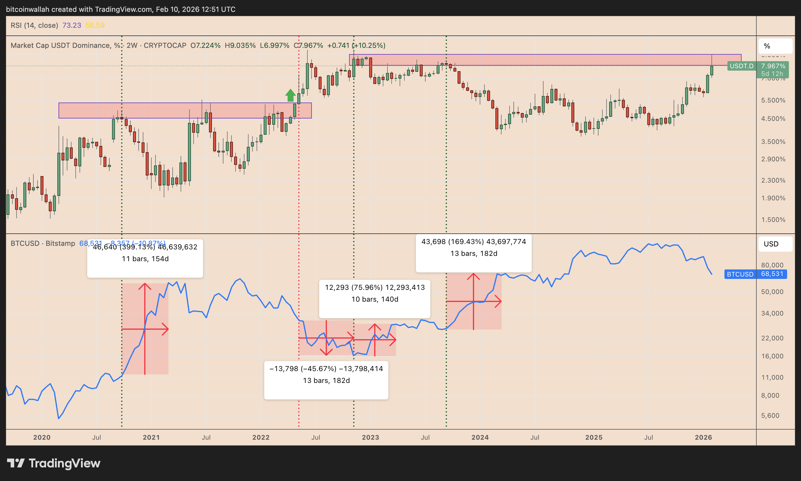 自2022年11月以来,每当USDT占比从8%-9%区间回落,均引发比特币强势反弹。其中一次回调后140天内涨幅达76%,另一次则在180天内实现169%的增长。2020至2022年间,当关键阻力位于4.5%-5.75%时也出现类似模式。