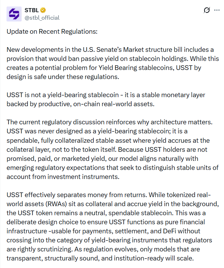 STBL 在 1 月 14 日的 X 帖文中写道,尽管底层现实世界资产在后台持续产生收益,但这一新的稳定币框架试图将稳定币与收益分离,以规避近期监管对生息稳定币的审查。